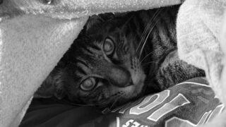 iPhone 17 Pro 1/33s f/1.8 ISO400 48mm あら、トラ君。ママの脱ぎ捨てたパーカーの隙間からお顔だけ出して。モグラさんの真似? 違うよ!ここが一番あったかくて、ママの匂いが凝縮されてて落ち着くんだよ。私の特等...