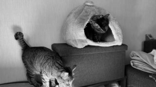 iPhone 17 Pro 1/50s f/1.8 ISO320 48mm トラ君、ここがアタシたちの定位置よ。全方位をチェックするわよ。 はい、ミー姉さん!ボクたち、ちゃんと仕事してるよね?あの人間、また変な動きをしてないか監視しなきゃ。...