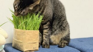 猫草を食べるトラ君の姿が捉えられている。猫草は紙袋に入っており、日付のようなものが記載されている。