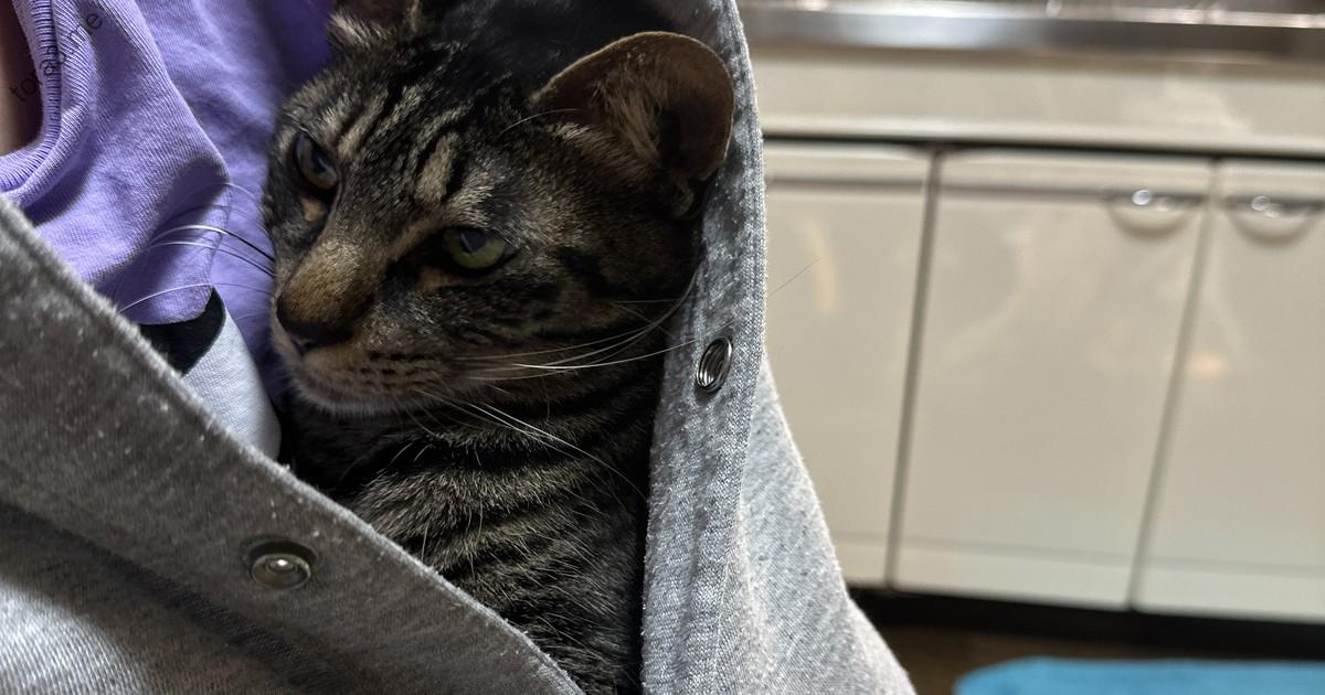 甘えん坊のトラ君(1歳11ヶ月)は、ママが食事中でもお構いなし。大好きなグレーのパーカーの中に潜り込んで、喉をゴロゴロ鳴らしてリラックスしています。パーカーの生地をふみふみする感触と、ママの温もりが心地良いのでしょう。時折、パーカーの中から顔を覗かせ、満足そうな表情を見せてくれます。