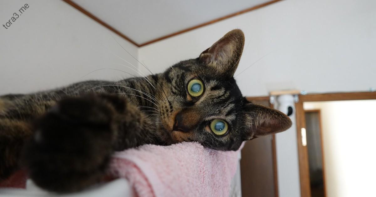 暑い夏の日、トラ君(2歳3ヶ月)は高い場所に陣取ってリラックスしています。夏バテ気味なのかもしれませんね。高い位置は温度が高いはずですが、寝心地の良さを優先しているのでしょうか。普段から高い場所が好きなので、いつものお気に入りスポットなのかもしれません。隣の部屋ではミーちゃん(3歳6ヶ月)が涼しい場所を探して移動しています。