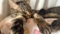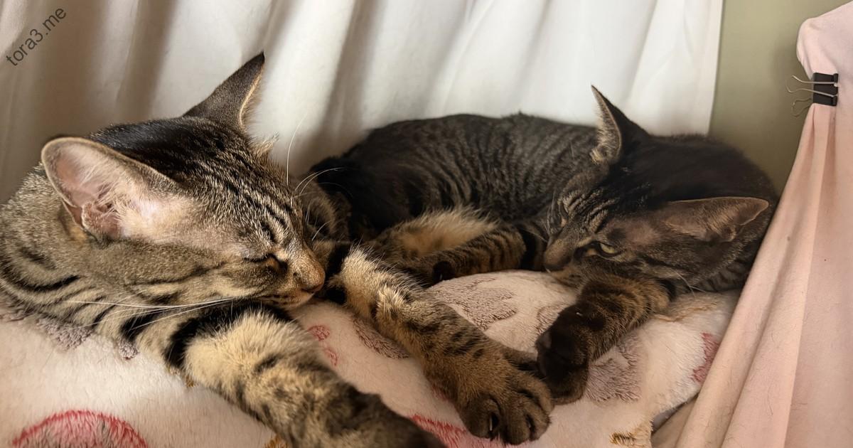 お昼寝中のミーちゃん(2歳5ヶ月)とトラ君(2歳5ヶ月)です。二匹は追っかけっこをした後だったのでしょうか、寄り添って幸せそうに眠っています。よく見ると、トラ君はうっすらと目を開けて、ミーちゃんのほうを見ているのがわかります。まるでミーちゃんを守っているかのようです。二匹の間には、安心感と愛情が満ち溢れていますね。見ているこちらも、心が温かくなります。