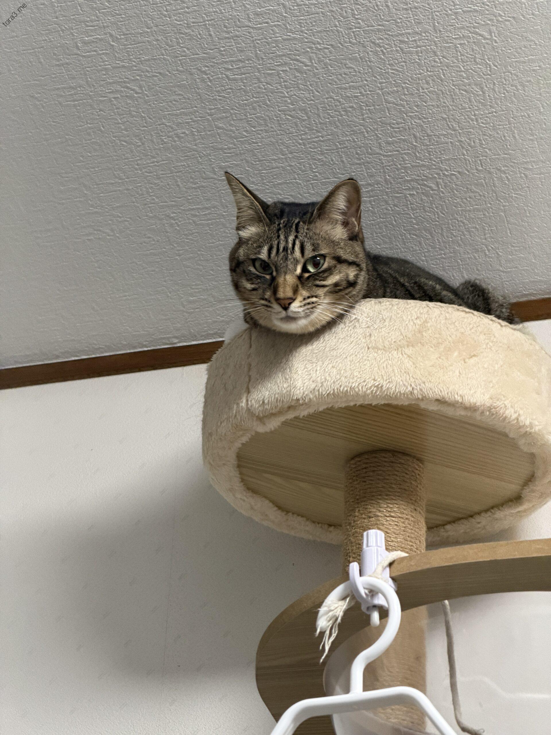 ミーちゃんは、猫タワーの最上段が大好き。いつもそこでくつろいでいます。高い場所から部屋全体を見渡せるのがお気に入りなのか、じっと観察していることが多いです。でも、そのほとんどは寝ている時間かもしれません。ふかふかのベッドで安心して眠る姿は、見ているだけで癒やされますね。時々、退屈そうにこちらを見下ろしてくることもありますが、それもまた可愛らしい瞬間です。