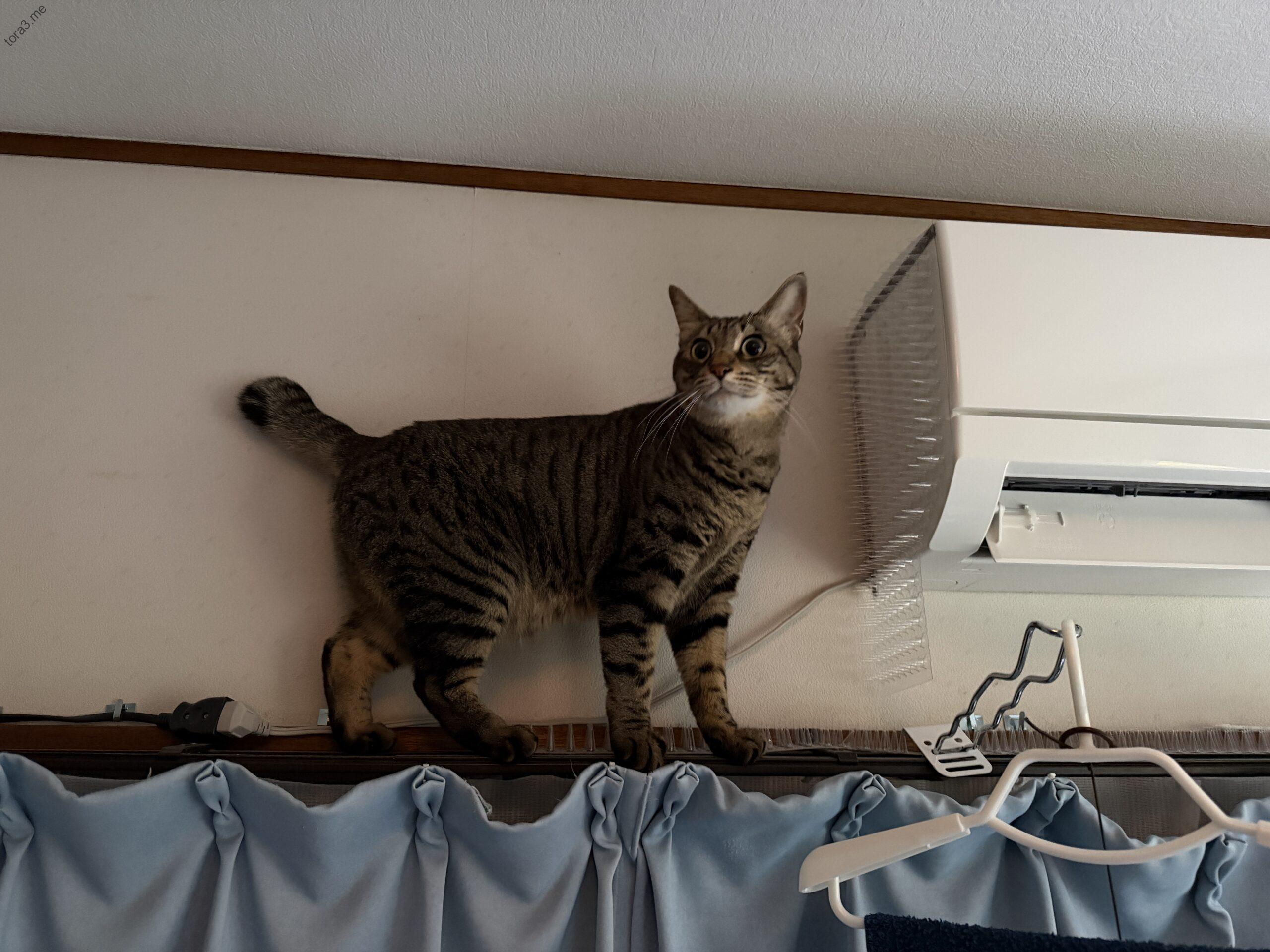 いつものように高い場所から見下ろしているミーちゃん。今日はどうやら何か考え事をしているみたいです。視線の先には何があるのかな?少し不安げにも見える表情が、なんとも言えませんね。もしかしたら、今日のおやつは何かな?なんて考えているのかも。
