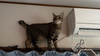 今日はなんだか気になることがあるの。カーテンの上から、じーっと見つめて考えるミーちゃん。