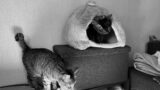 最高の見張り台!トラ君とミーちゃん【キジトラ写真集】 キジトラ写真集 2026.01.082026.01.10 この記事は約1分で読めます。 iPhone 17 Pro 1/33s f/1.8 ISO320 48mm わー、ボクたち、こんな高いところにいるんだね!ミー姉さん、落ちない?ちょっと怖いよ。 落ちるわけないでしょ。アタシたちはハンターなんだから、ここが一番安全で、部屋全体を支配できる場所なのよ。 ふーん。人間が下でゴソゴソしてるのがよく見えるね。何してるんだろう? さあね。どうせまた、アタシたちの写真を撮ろうとしてるんでしょ。まったく、わかりやすいわね、人間って。